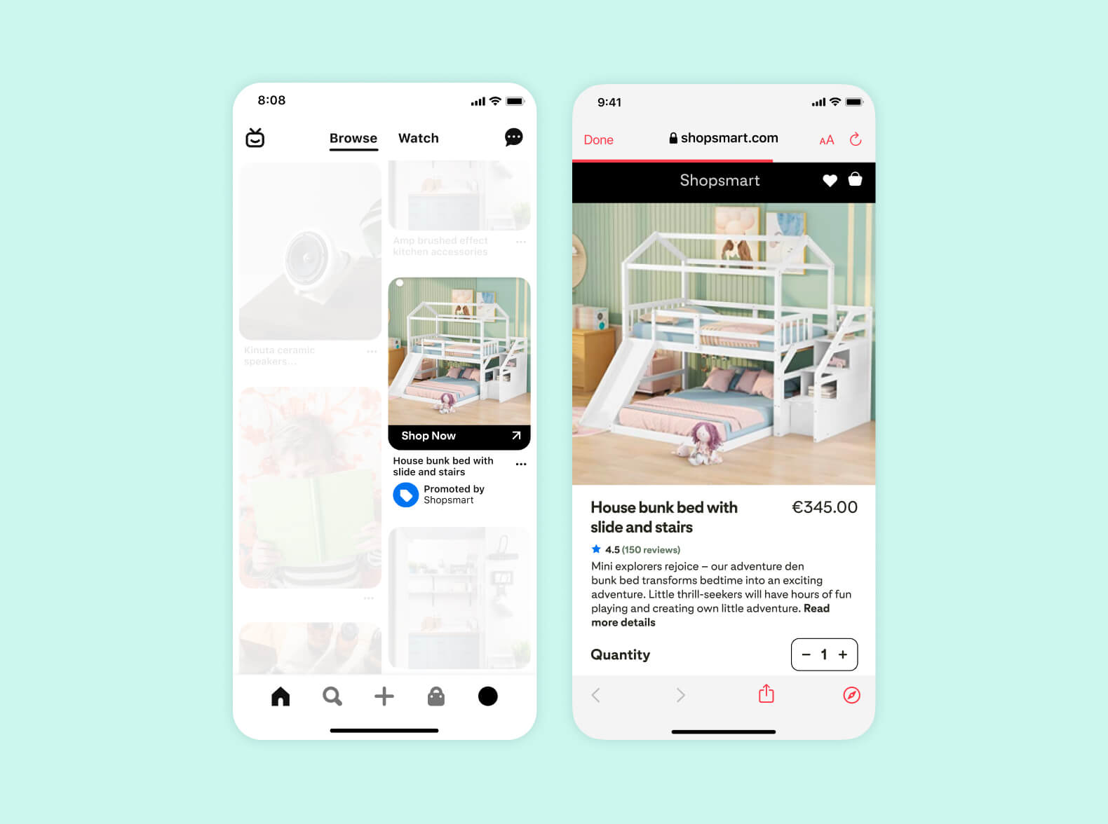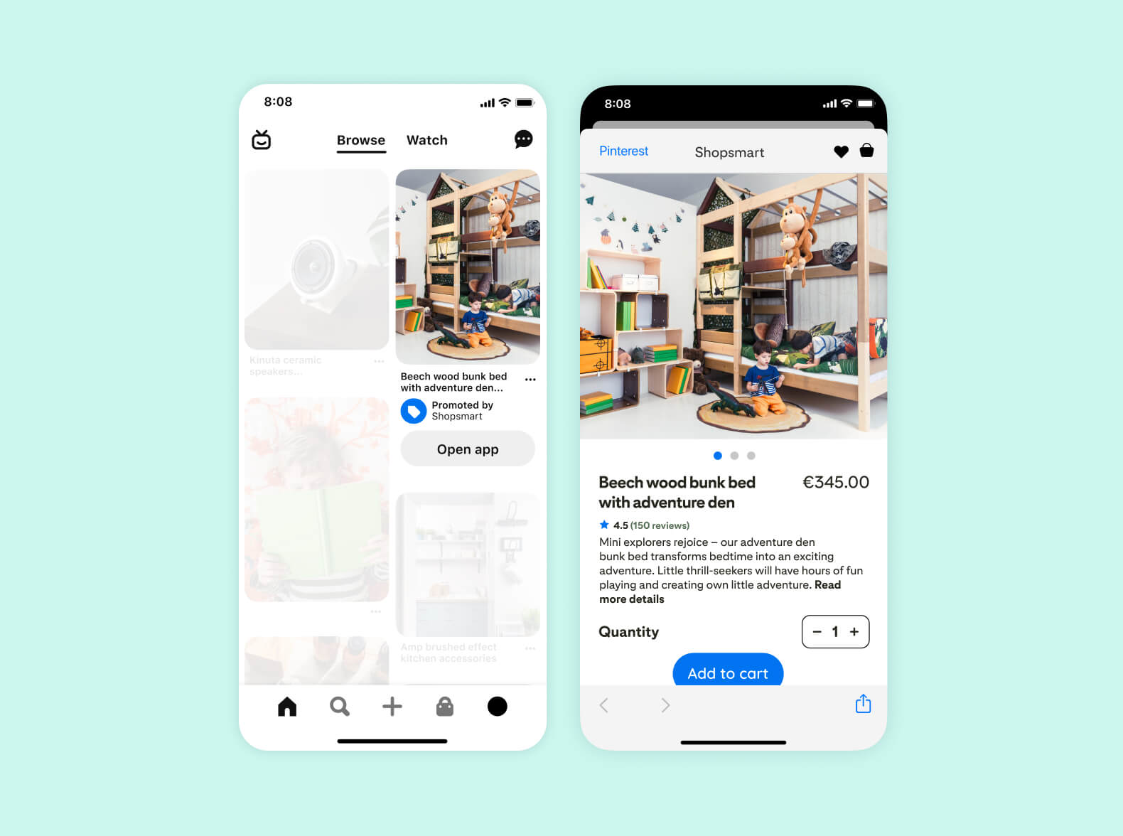 Indem du Mobile Deep-Links in deine Conversion- und Shopping-Kampagnen integrierst, kannst du die Nutzer*innen nahtlos von der Pinterest-App zu bestimmten In-App-Produktseiten weiterleiten. Du bringst potenzielle Kund*innen also direkt zu deinem Produkt und vereinfachst so den Checkout-Prozess.