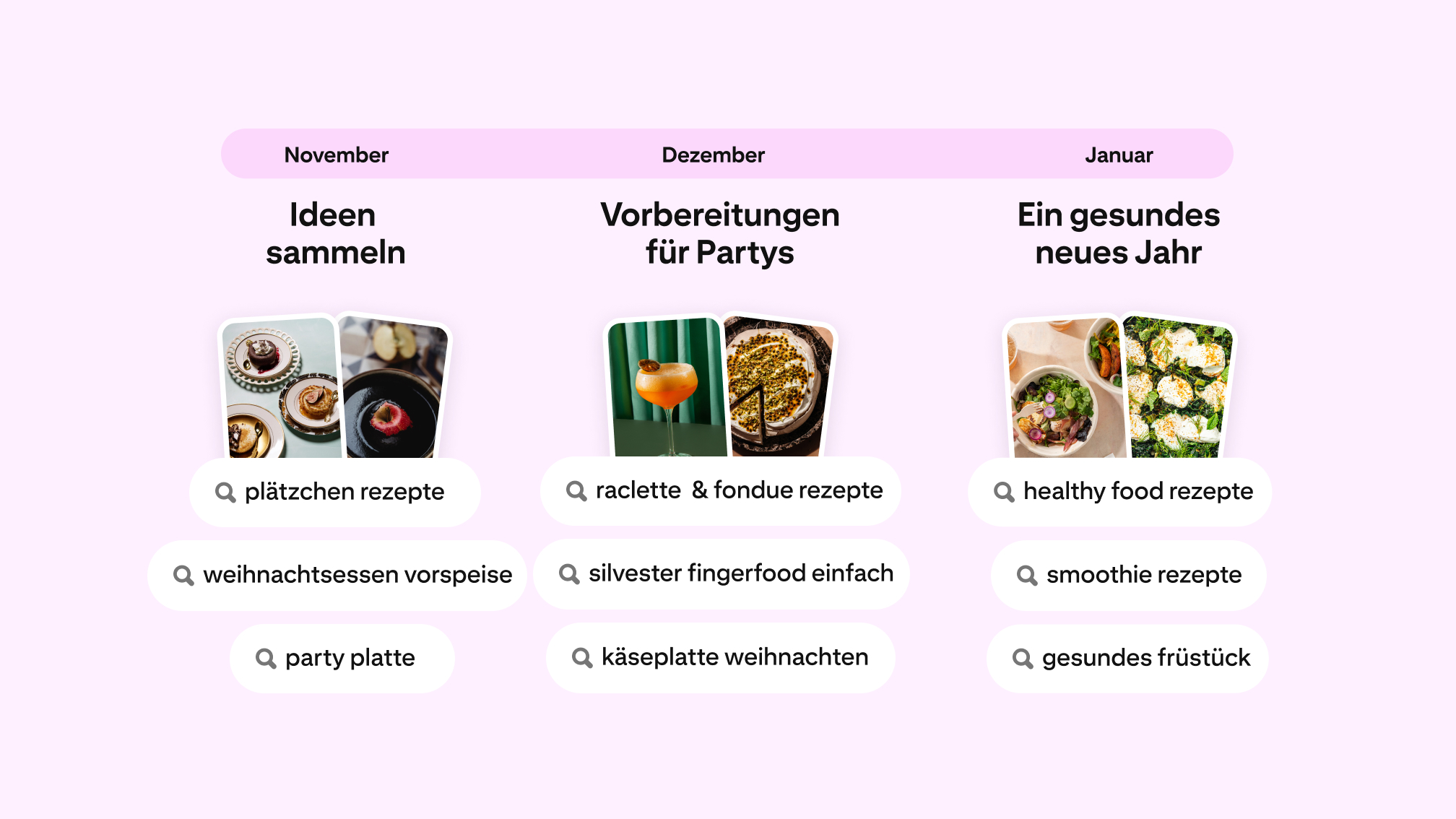 Die Suche nach festlicher Inspiration beginnt bereits im Juli und erreicht im vierten Quartal ihren Höhepunkt.2 In diesem Zeitraum wechseln die Nutzer*innen vom Entdecken von Ideen wie „Plätzchen-Rezepte“ zu gezielteren Party-Vorbereitungen und suchen nach allem von „Raclette- und Fondue-Rezepte“ und „Silvester-Fingerfood einfach“ bis hin zu „Käseplatte Weihnachten“.3