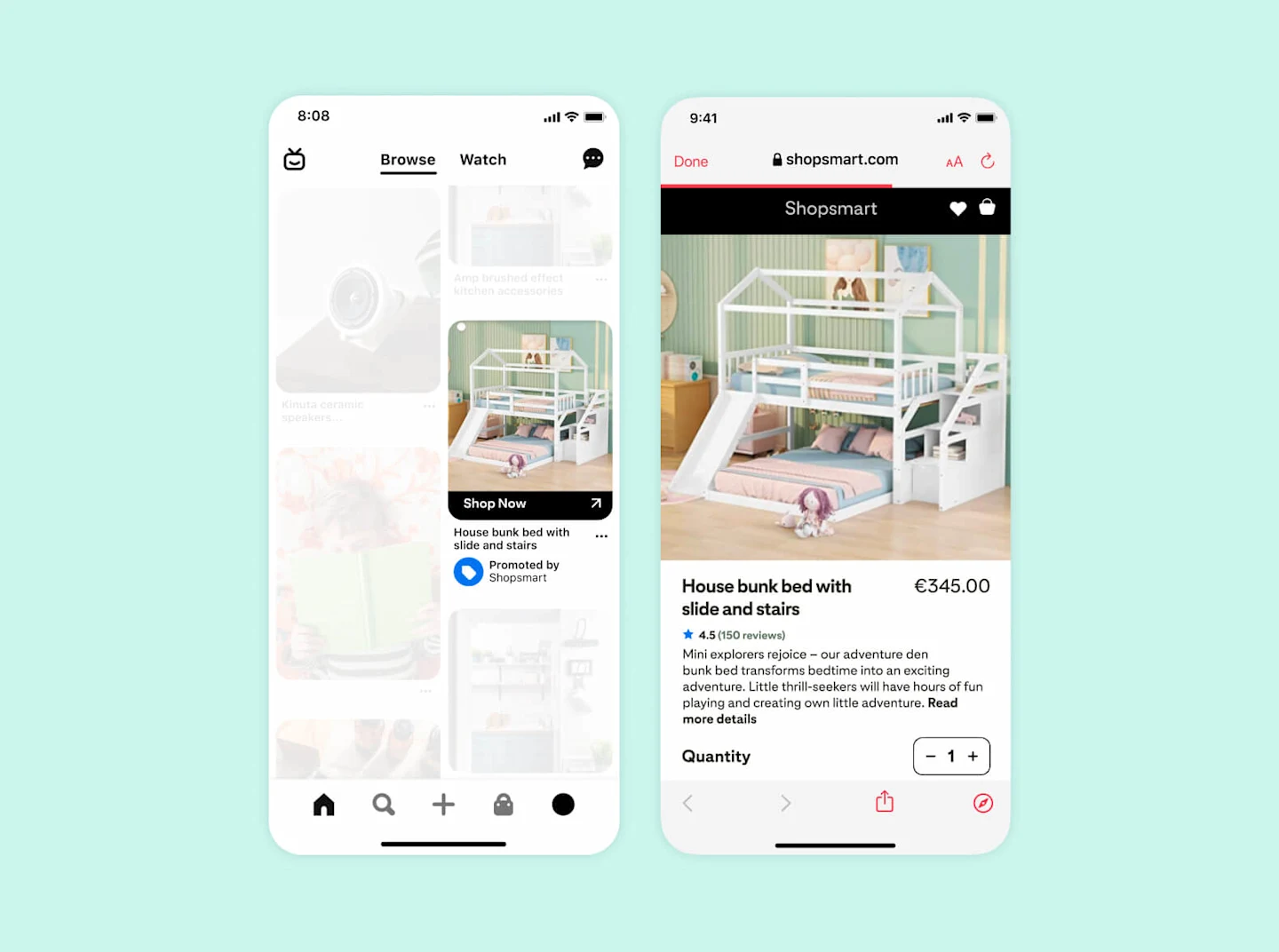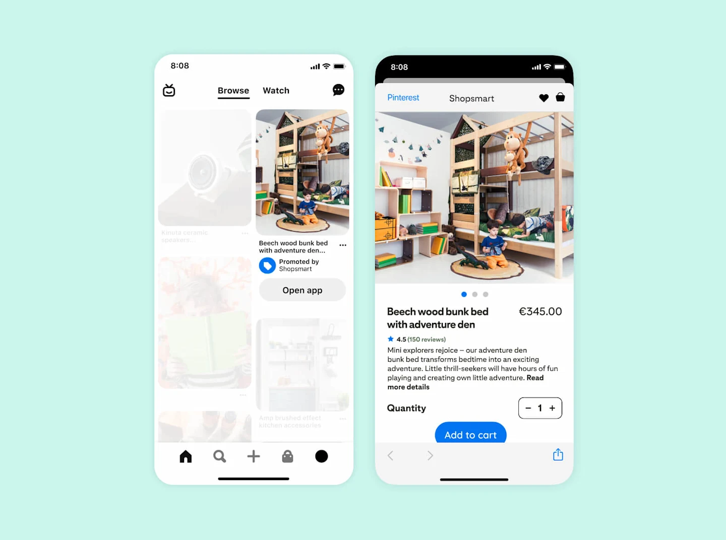 Si añades mobile deep link para móviles a tus campañas de conversiones y compras, puedes guiar a los usuarios desde la app de Pinterest a páginas de producto específicas en la app, lo que los acercará a tu producto y simplificará el proceso de pago.